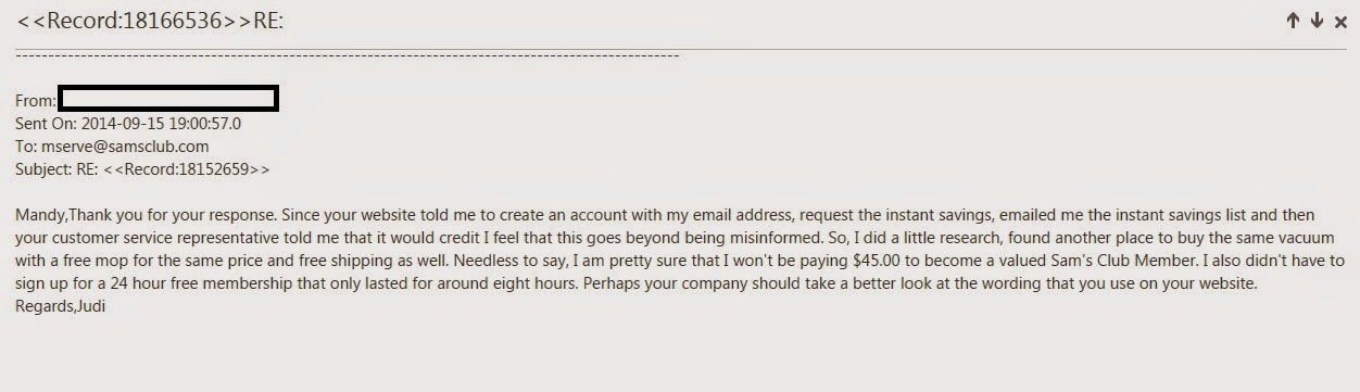 Imagine my surprise when this showed up 9/16 at 8:11 pm! After 24 hours with no response figured that ended that. Proof that I was right, Sam's Club really didn't care about my business. Must admit though, this rep is one sharp cookie, take your time and compare the two responses...